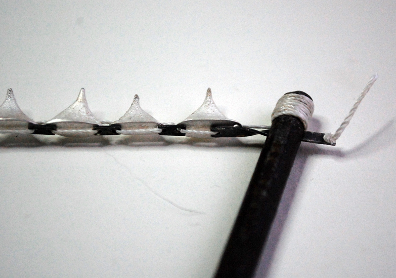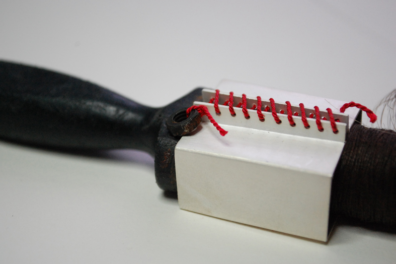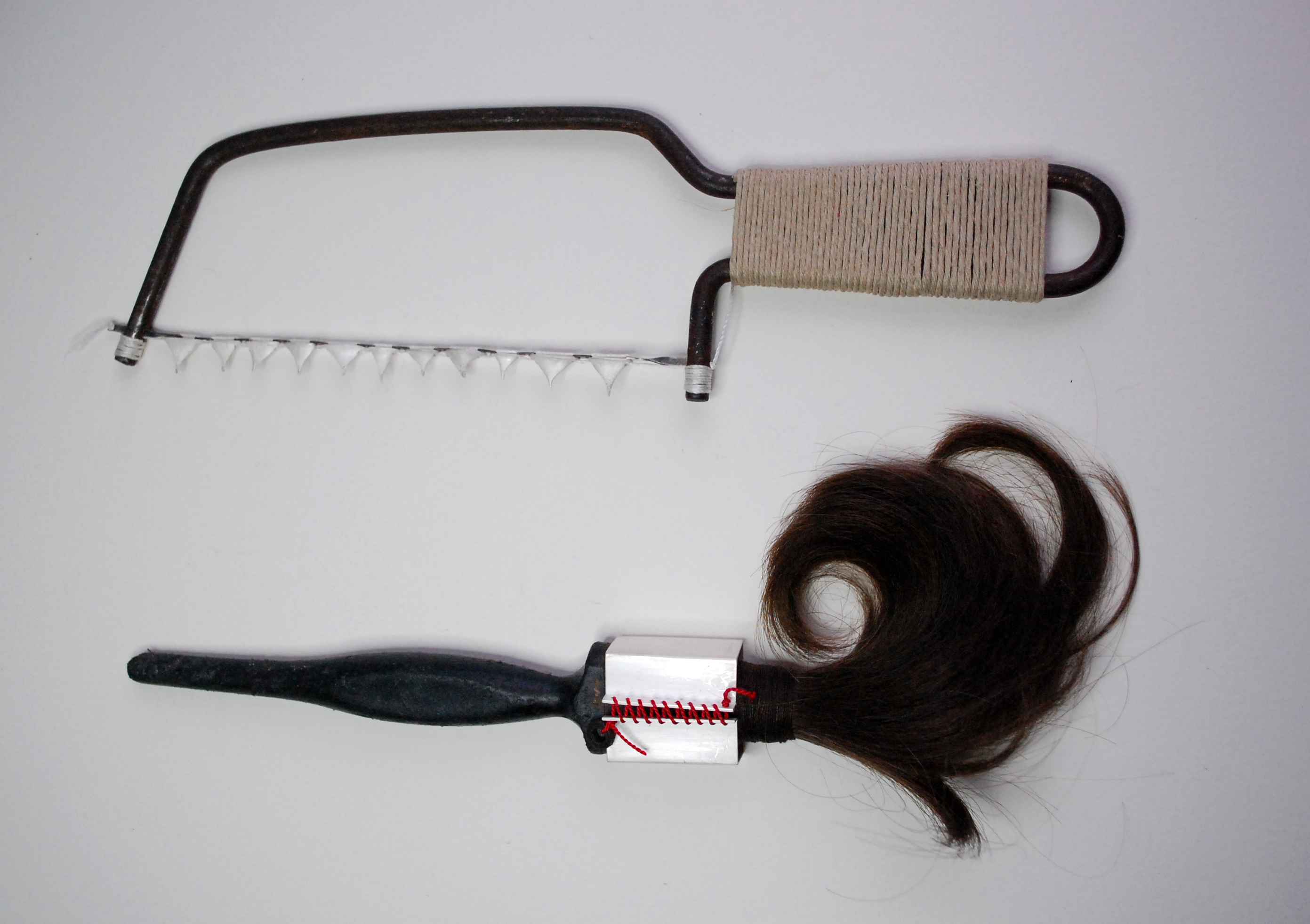 I got the opportunity to take part in the Contemporary British Silversmiths exhibition at the V&A, which runs for the next 3 months [I think!]. The theme was “Fit for Purpose”- which conveyed to me the idea of function and utility- ideas which are implied and subverted in the pieces I make. I always look at shapes and forms which relate to function- old tools, utensils and domestic forms so this theme set easily with my work. Recently I have picked up old parts of tools and I had thought of remaking/reconstructing them with alternative materials to give them an alternative sense of purpose. Perhaps implying a use in the ephemeral realm rather than the purely practical physical sphere of existence, the purpose being related to memory, emotion and experience instead. I chose two pieces to work with- a found plastic paintbrush handle washed up on the beach and a discarded rusty hacksaw frame. I take a great deal of pleasure in turning discarded old rubbish into pieces to be treasured and to me these pieces where just a precious as the silver I was pairing them with. For the brush I used my own hair- purely due to the need for a certain material quality- to keep it a brush, but still to take it beyond simple functionality. To join the handle I made a rectangular, laced up box- the pressure of the tied form keeping the two parts, hair and handle, together. I liked the angular form contrasting with the curves of both the handle and the bunched hair, distorted by the forms it held, tied tight with bright red silk. The saw frame i reworked by casting individual rose thorns in silver as teeth for the blade, these where strung on white silk thread and held in tension. I silk and enriched[white] silver set beautifully against the brown rusted frame, vivid and rich, and the handle was bound with linen twine, warm and functional.