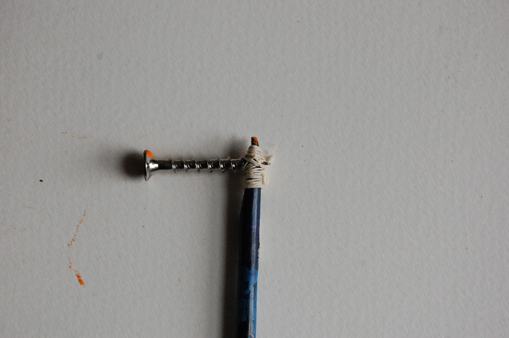 I used a screw, drilled into an old paintbrush and tied together with linen thread as the wood split, a hair pin tied on to an old paint brush and some gathered dried seed heads tied to to a dowel which slowly broke down as it was used.