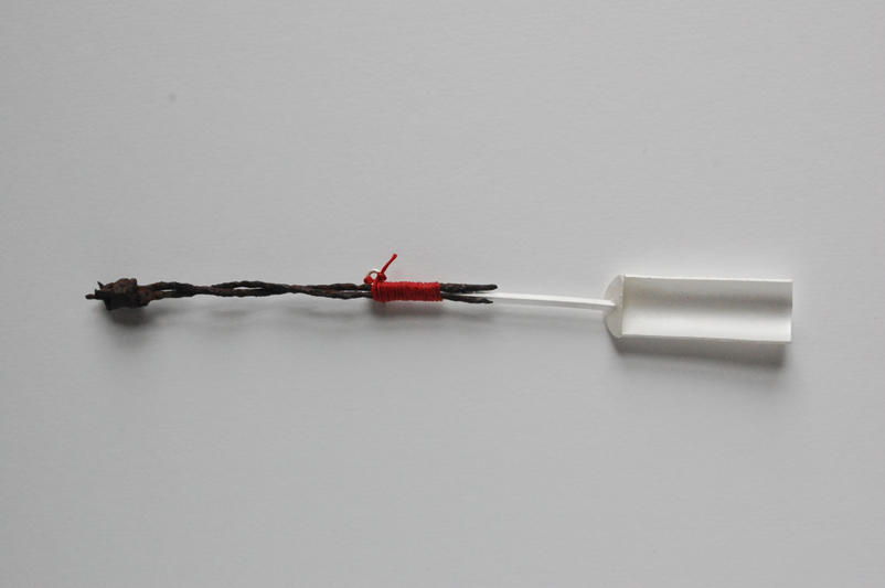 Long Spoon- barbed wire, silver, Linen thread.