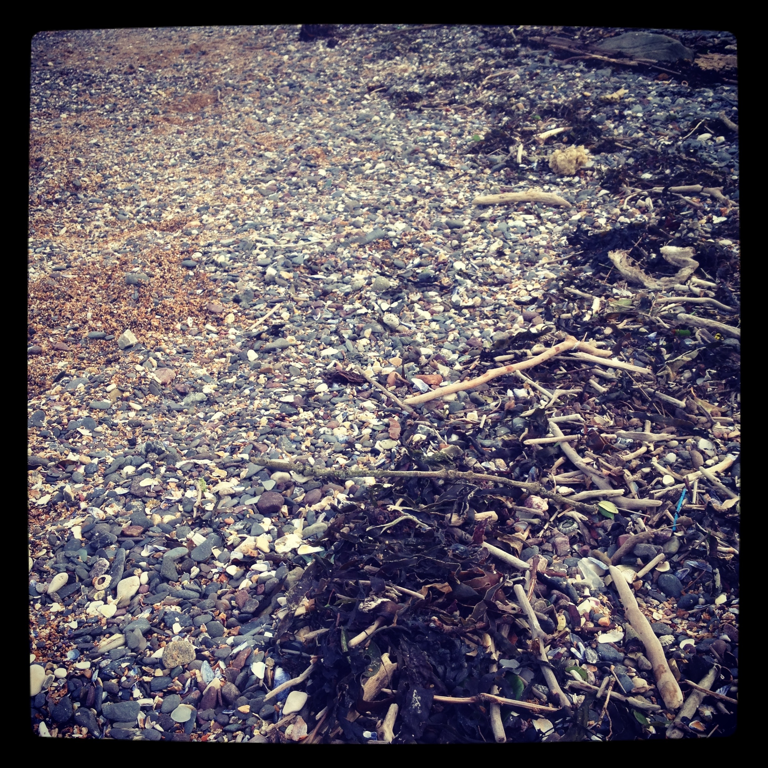 Found objects from a beach walk, high tide – lots of driftwood and plastic.