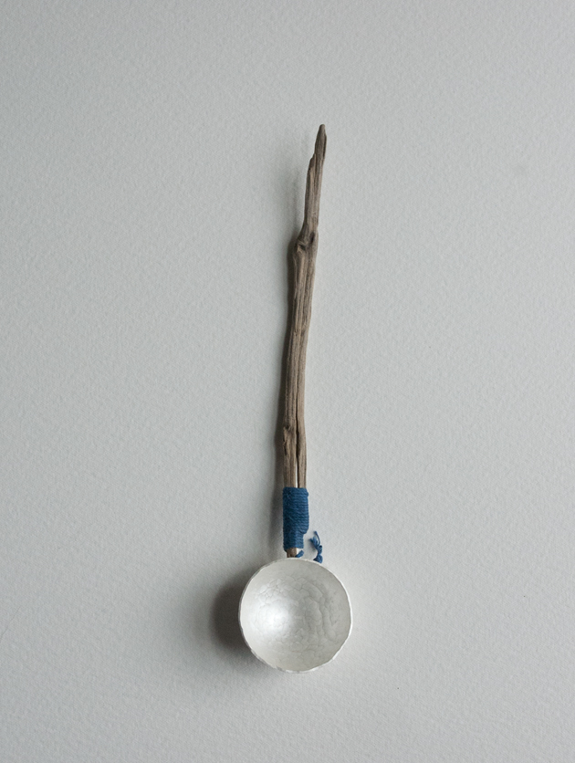 Spoon- Silver, driftwood, linen thread.