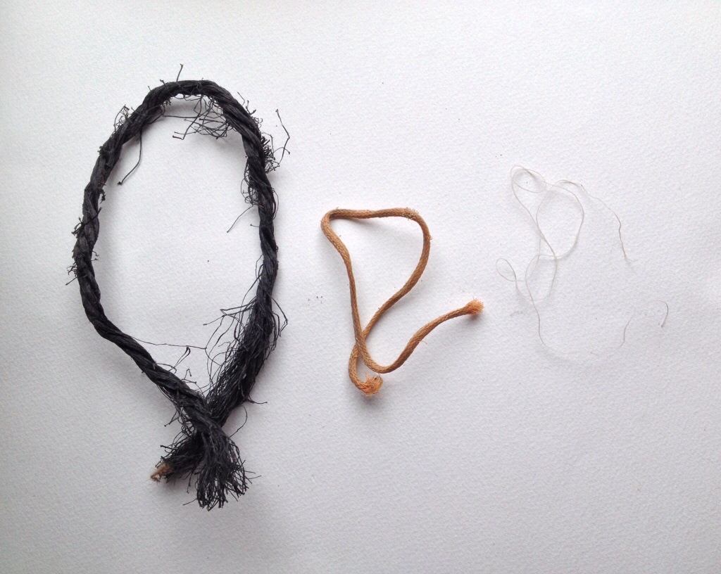 Coastal walk on Friday, found three pieces – black rope, cord and nylon thread. I liked the variation in thickness, texture and colour- especially the faded and frayed heavy black rope.