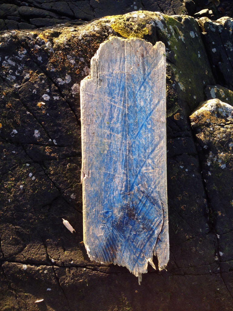I love the worn paint and random marks on this piece. Possibly for a larger object. Shore line find, wood.