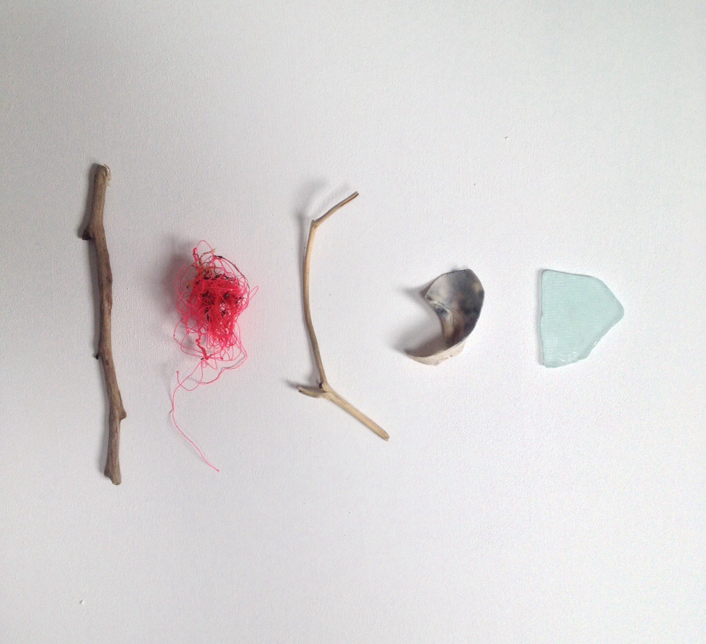 Beachfinds textured glass, shell, driftwood and fishing line.