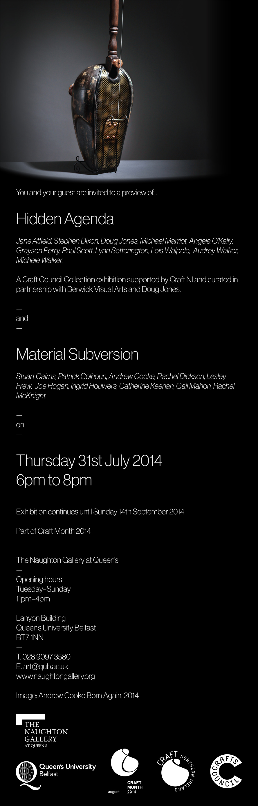 The next exhibition featuring my work will be Material Subversion, shown in alongside the Craft Council’s touring exhibition Hidden Agenda as part of august Craft Month at the Naughton Gallery at Queens University, Belfast. I will be showing a series of made pieces and found objects alongside work by Irish makers such as Gail Mahon, Rachel McKnight and Joe Hogan as well as artists from the Crafts Council’s collection including Grayson Perry, Doug Jones and Angela O’Kelly. The exhibition opens on Thursday the 31st of July and continues until the 14th of September.