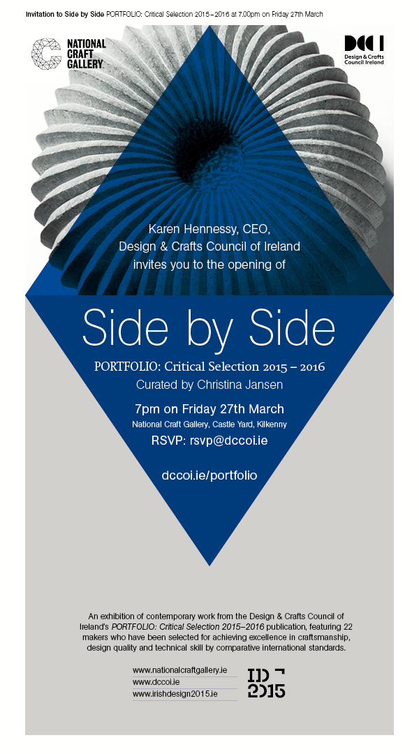 The exhibition Side to Side curated by Christina Jansen, ,director of the Scottish Gallery, opens this week on Friday the 27th of March at the National Craft Gallery in Kilkenny, Ireland. The show features the work of 22 makers from the Portfolio Critical Selection 2015 and features a 12 piece set of my work alongside silversmiths Cara Murphy, Mike McCrory and Cóilín O Dubhghaill as well as makers form other disciplines such as ceramicist Sara Flynn and basket maker Joe Hogan.