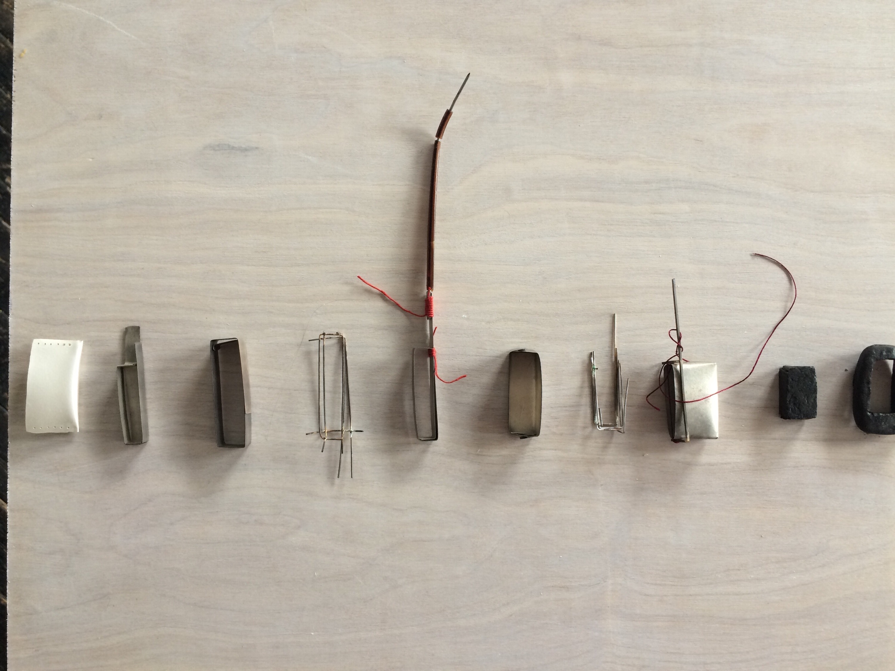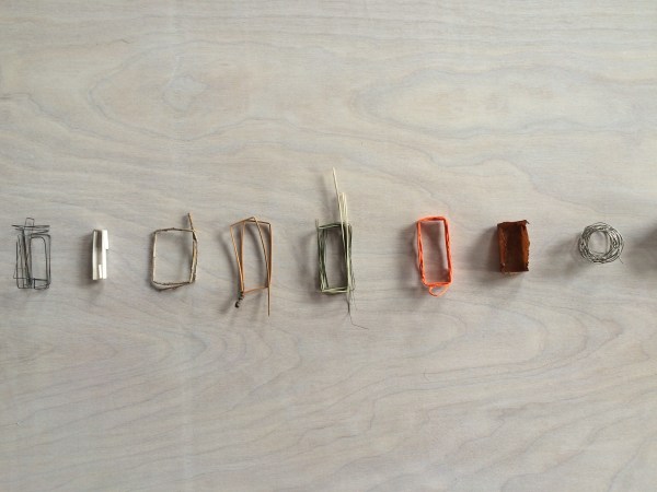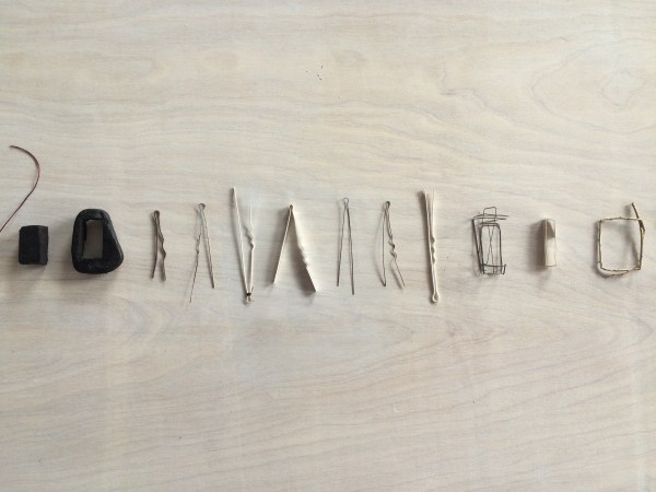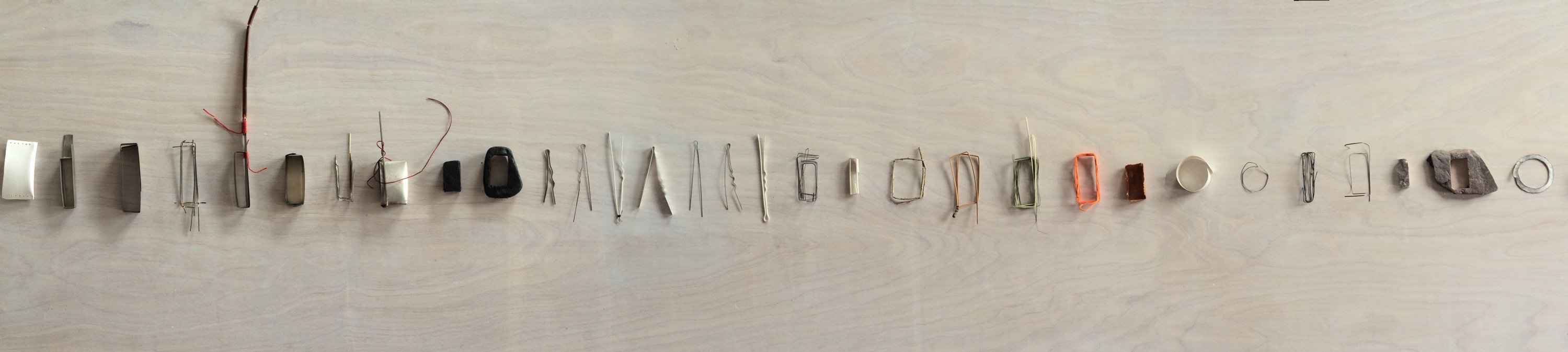 A few weeks ago I showed a series of small material drawings at the Mak9 exhibition The Lime Walk Project at Pollen Studios. It was a series of explorations in different materials looking at simple shapes of Bobby pins, circles, cylinders, rectangles and boxes. Theses are ongoing investigations, some of which are incorporated into more complete objects while others sit as they are as I question what a complete object might be. I’m calling this type of laid out work Driftlines – it makes me think of tidelines, driftwood, flotsam and jetsam and represents a journey, wandering through a landscape of making and collecting. In this series the individual elements can be relatively simpler as they are part of a larger, more complex composition. I intend to develop this format of working in future works.