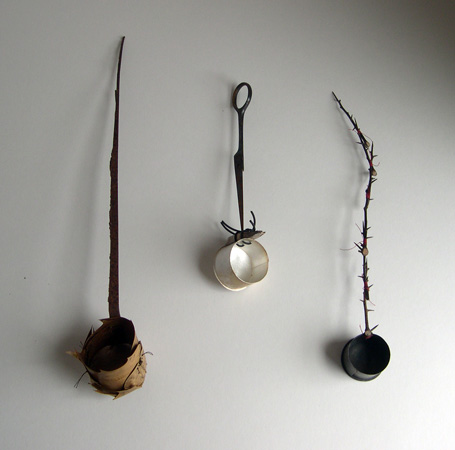 Ladles- steel, leaves, linen thread, silver, rubber, scissor half,thorns and silk thread.